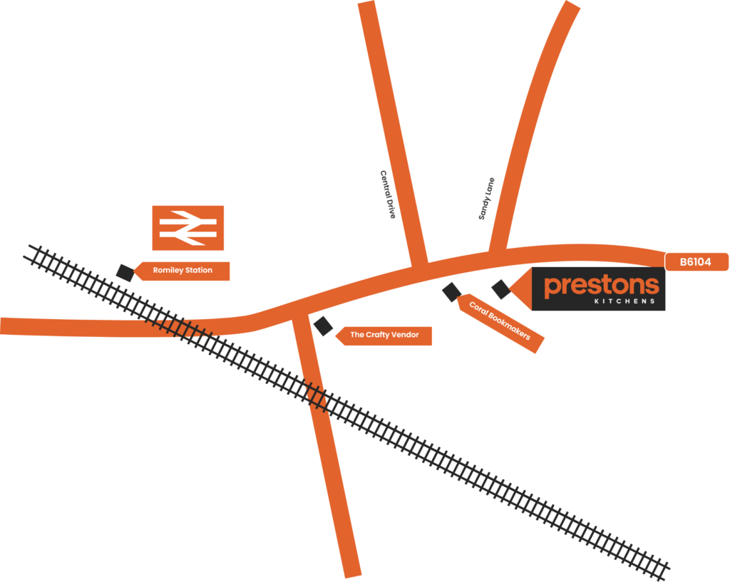 Discover high quality, German rigid kitchens in Stockport at flat pack prices. Our Prestons Kitchens Showroom, on Compstall Road is not far from Romiley train station. Here you’ll find a stylish selection of contemporary kitchen displays, featuring the very best in German manufacturing, designed by the best in the business from a team with decades of combined experience.